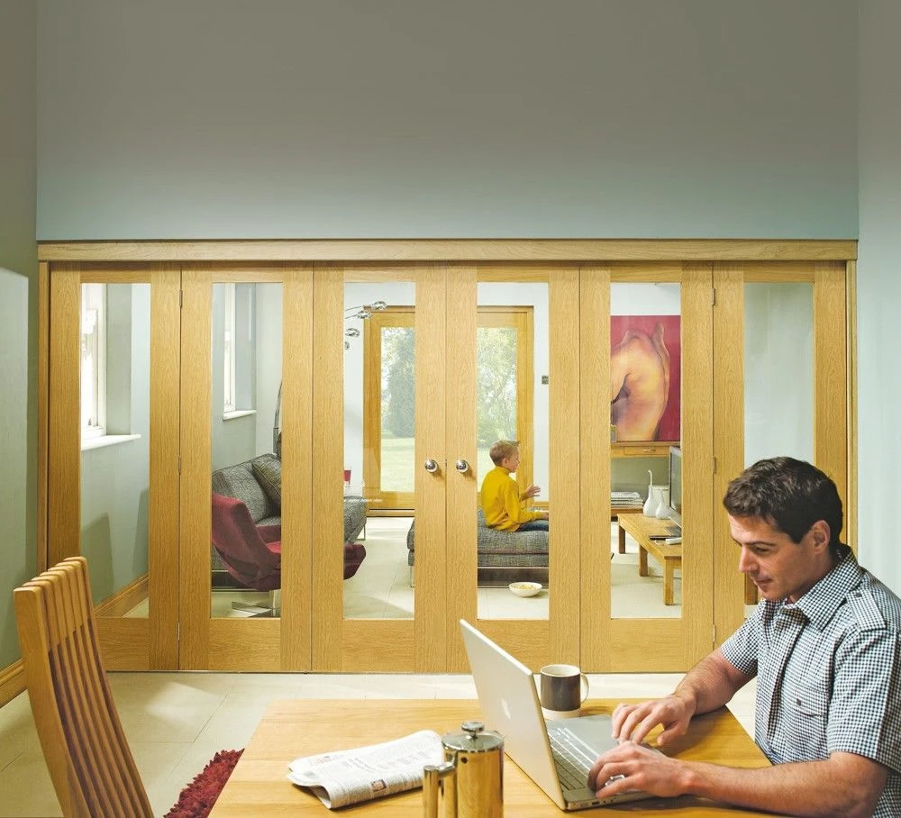 The Freefold provides the option to either fold open all doors to create one large room for entertaining or close them to create two separate living spaces. Available on any 24″ internal oak door. The Freefold includes a head, jambs and stops as well as a floor mounted guide and all hardware (excluding handles). The Freefold is a top hung system. System shown with Pattern 10 Oak Doors.