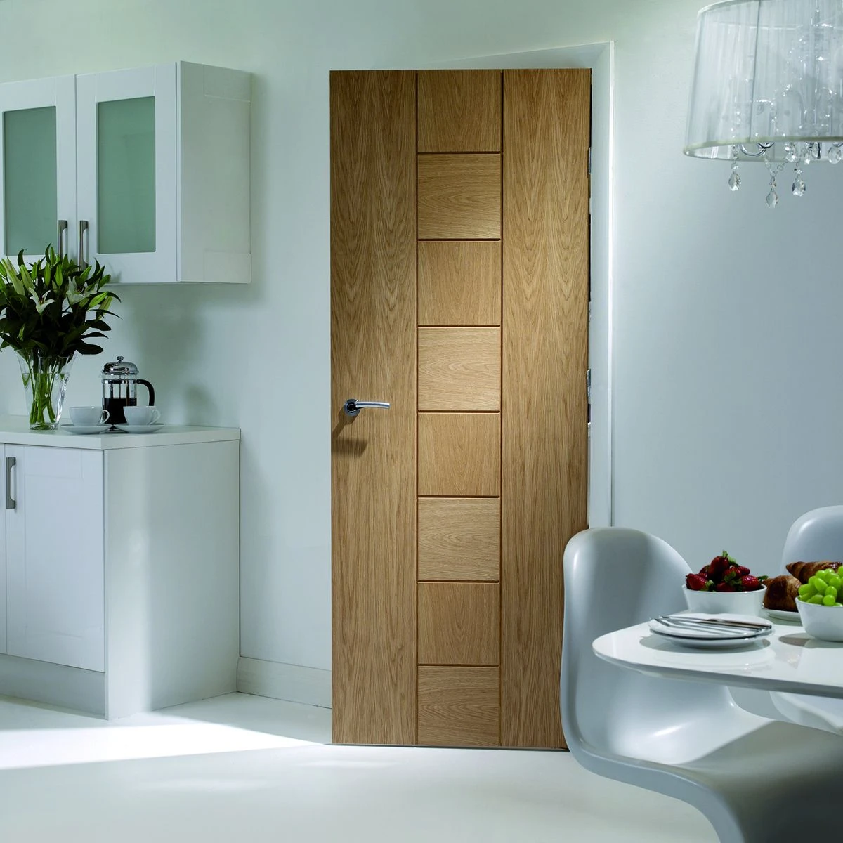 The Messina oak door has a fresh modern style combining horizontal and vertical grain panels. Once finished this door will act as a real centrepiece to any home. The Messina oak door range includes matching glazed and fire doors.