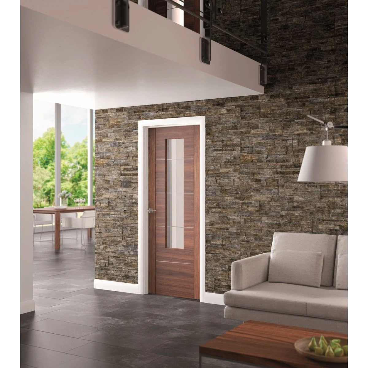 The fully finished Walnut Portici blends contemporary horizontal grain with real aluminium inlays to create an impressive looking door that would bring a touch of class to any home. A clear glazed panel in the centre of the door allows for light to be transferred from one room to another and the intricate etching gives this door a real sense of style. Pre-Finished in a clear AC lacquer and ready to hang. Complementary panelled and fire doors are also available in the range along with an Oak alternative.