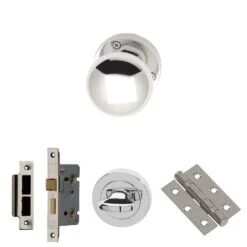 Also in the box you’ll find three high-quality steel ball bearing hinges – just choose the size you require. Not only do the hinges ensure a smooth and quiet door closing action, they match the Vedea handle to perfection. And because you’ll want to lock your bathroom door, the Vedea pack includes a turn and release lock with a patented bolt reverse mechanism in the same sleek Polished chrome finish.