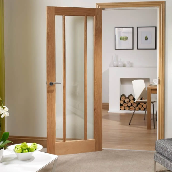 - A striking fully finished oak door with three vertical panels and clear glass